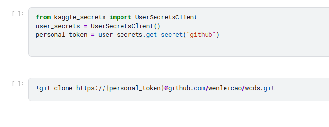 in your kaggle notebook you can use the token value to set up a secret in key value format. in my case, I call it github.