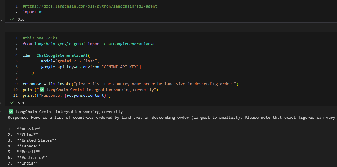 In the second cell, I import necessary functions for google Gemini and create an LLM object. This object can invoke Gemini 2.5 flash. You will need a Gemini API key for this. I use the free tier and you can find info on how to get an API key online. In this case, I saved the API key in the environment variable setting in Windows, so I can use os.environment to retrieve the key value. After that, I use the LLM object to see if it can answer a question. It does give an answer, so LLM works fine. By the way, I think China ranks 3rd place, but AI calculated differently (it does not include inner water surface area like Hudson bay).