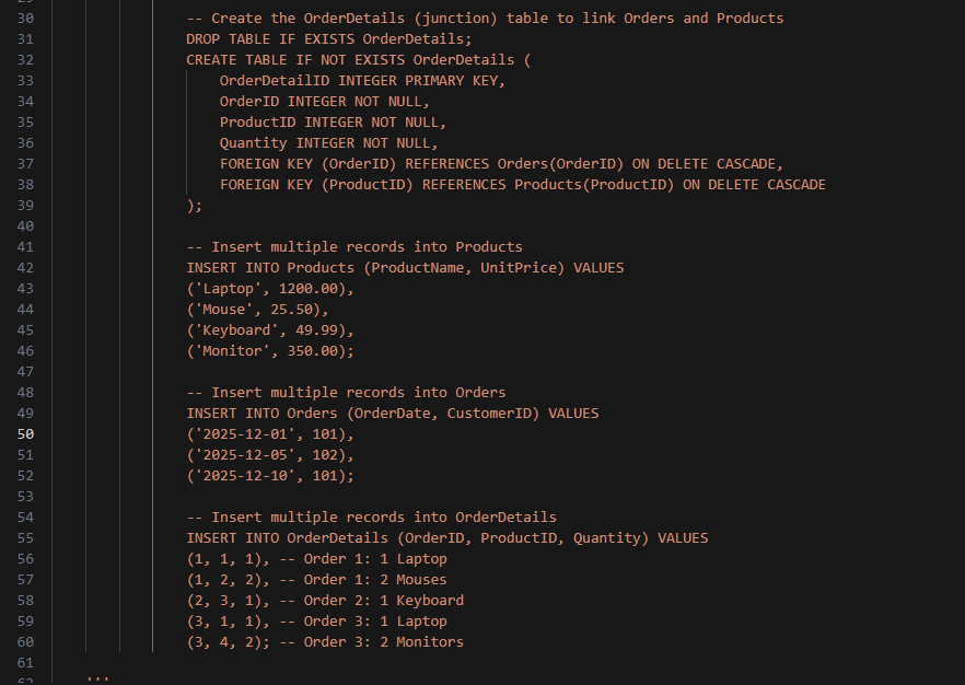 At line 37 and 38, you can see foreign keys are implemented and some dummy data are inserted between line 41 to 60.
