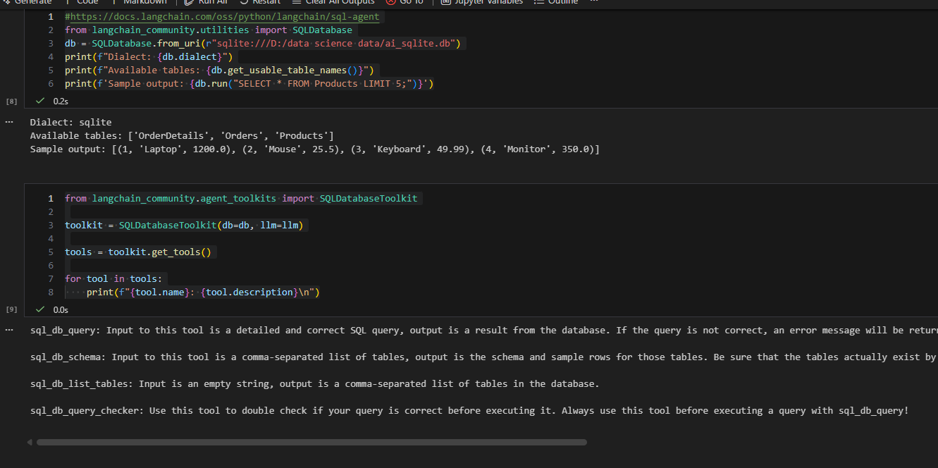 Next step, I leverage langchain package which has function wrappers to interact with databases. Behind the scenes, Langchain can use the functions to recognize database type as Sqlite, table list, and sample table data.