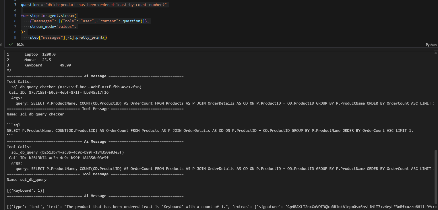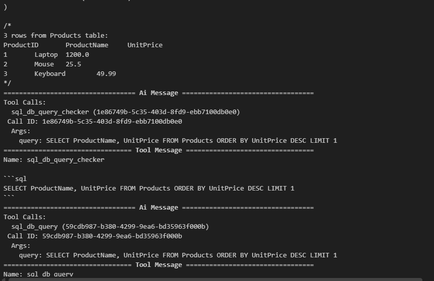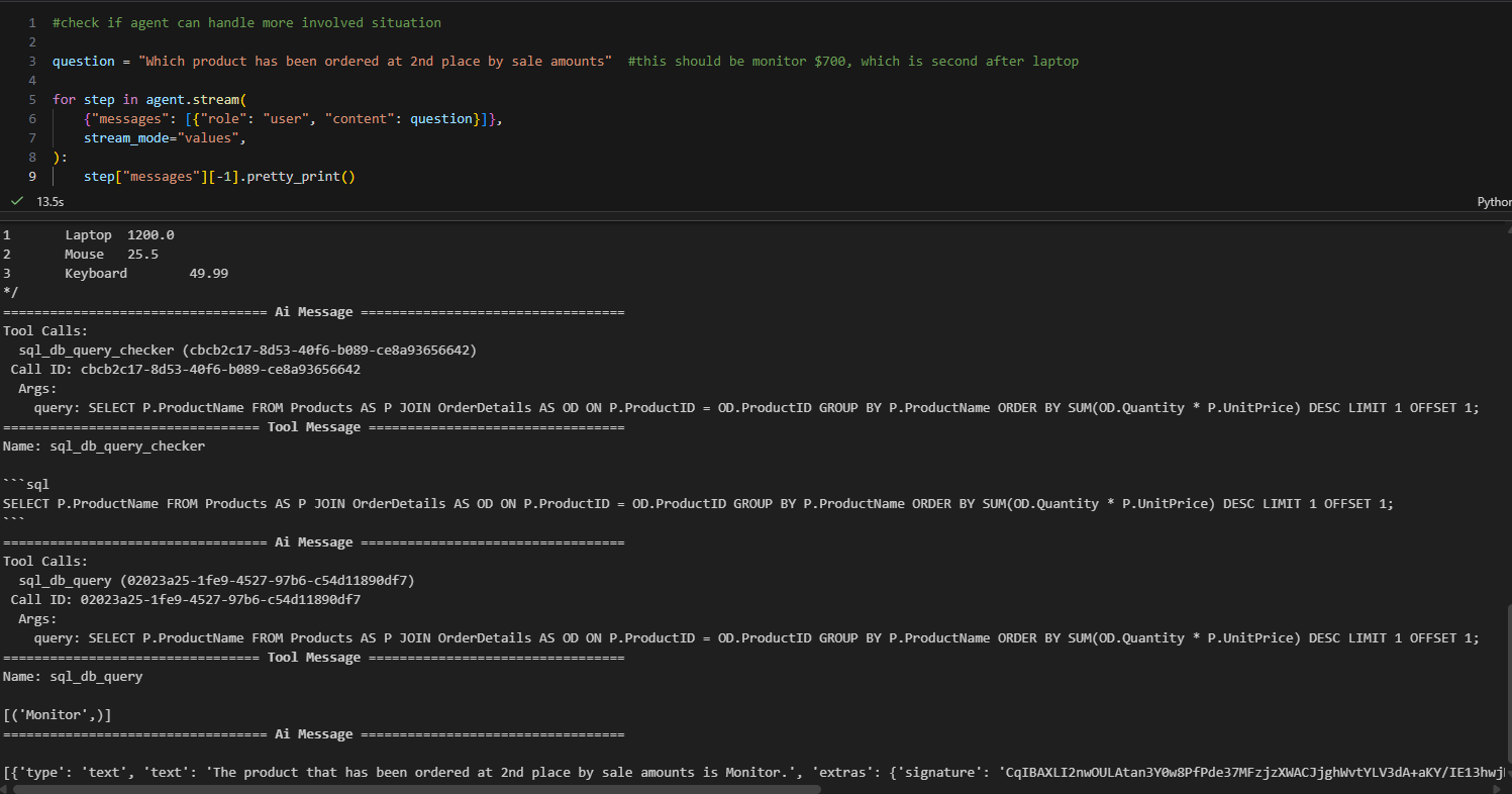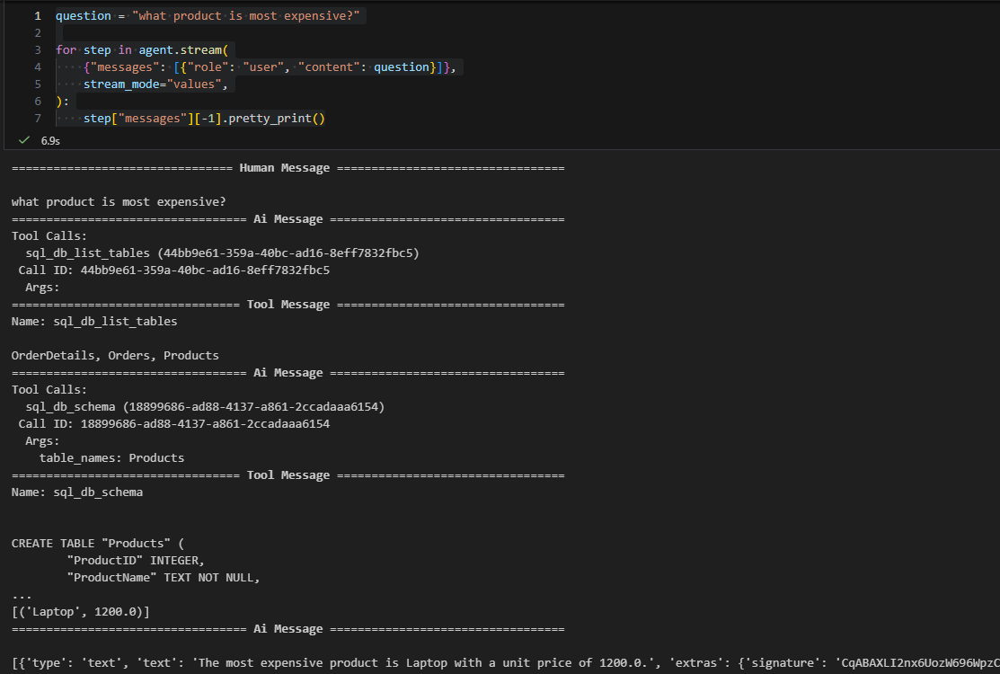 First, I let it pick the most expensive product (a simple one involving only one table). You can go through the log and see how it did it. First it used a tool to list tables, then it found the product table. Next, it checked the columns in the product table. Finally, It found that laptops are the most expensive product.